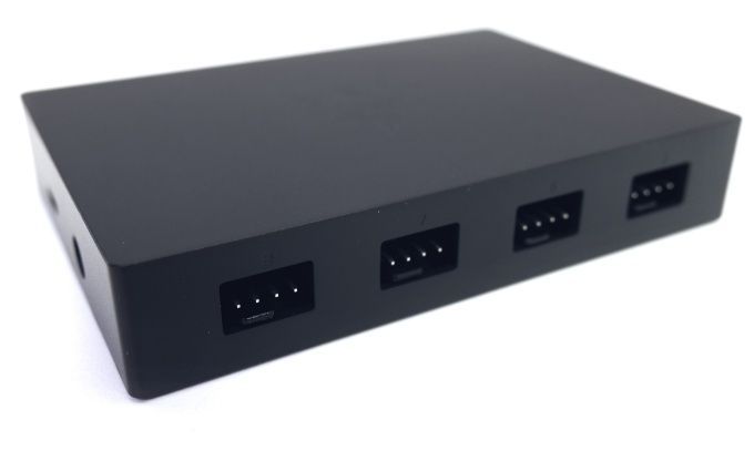 Der Lüftercontroller zeigt sich als schlichte schwarze Kunststoffbox. In den beiden langen Seiten sitzen je vier PWM-Anschlüsse.