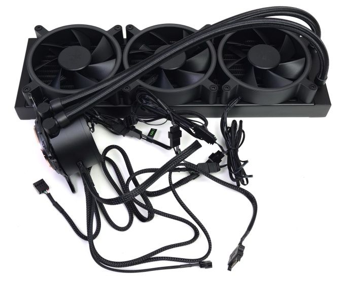 Die A-RGB-Kabel können miteinander verbunden und über die Kabelpeitsche zudem an die Kühler-Pumpen-Einheit angebunden werden. Das geschieht auch mit den drei PWM-Lüftern. Über das USB-Kabel lassen sich dann Lüfter, Beleuchtung und Pumpe steuern. Zur Stromversorgung dient ein S-ATA-Stromanschluss.