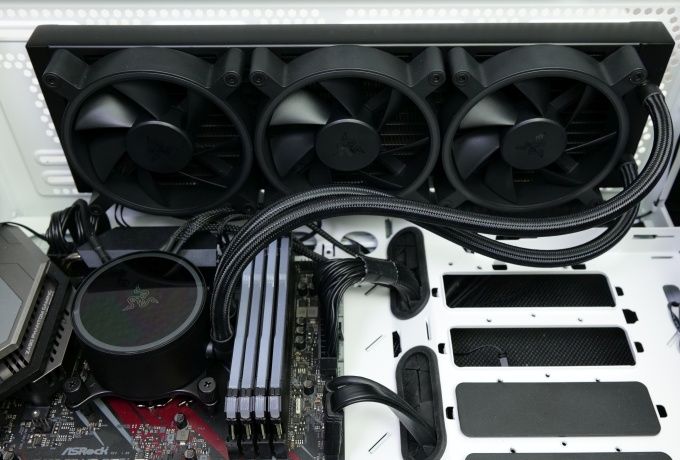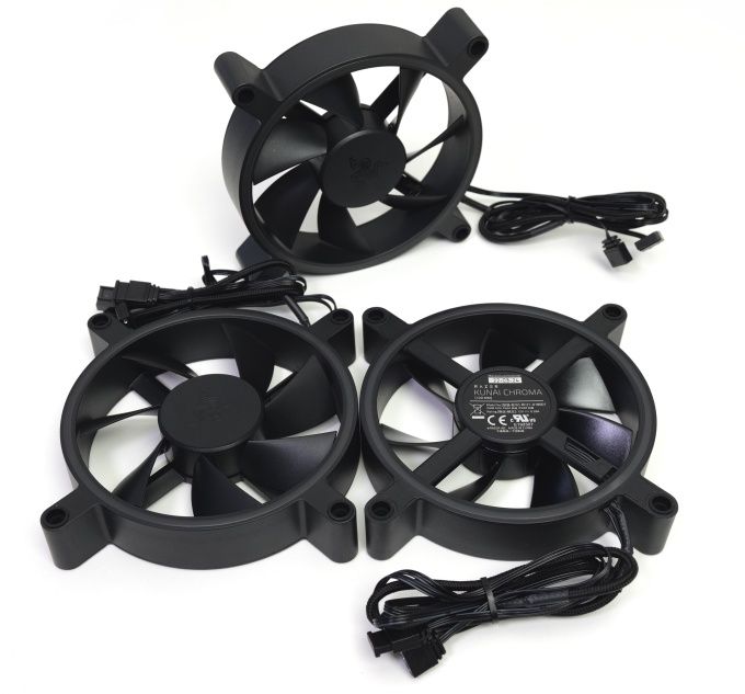 Bei beiden Modellen werden die gleichen Lüfter eingesetzt. Diese Kunai Chroma-Lüfter bietet Razer übrigens auch separat an. Sie fallen durch den kreisrunden Lüfterrahmen auf. In ihn wurden 18 A-RGB-LEDs integriert. Die PWM-Lüfter erreichen laut Razer eine Maximaldrehzahl von 2.200 U/min. An jedem Lüfter hängen gleich drei Kabel: Ein gesleevtes PWM-Kabel, ein A-RGB-Kabel mit Stecker und eines mit Buchse.