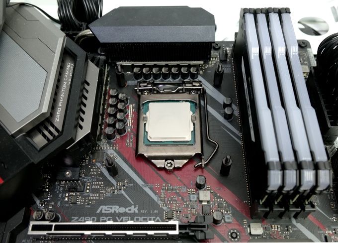 Die Montage auf dem Intel-LGA-1200-Testmainboard ist Asetek-typisch sehr unkompliziert. Man dreht einfach vier Montagebolzen in die Kunststoff-Backplate.