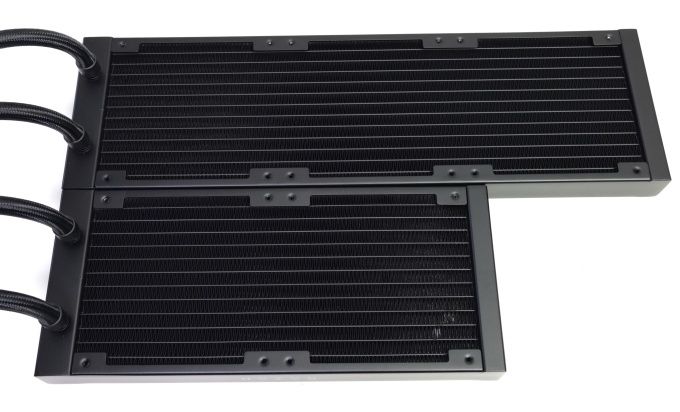 Die Radiatoren werden für beide Modelle aus Aluminium gefertigt. Der Wärmetauscher der Hanbo Chroma RGB 240 mm misst 275 x 123 x 30 mm (L x B x H). Der Radiator des 360-mm-Modells ist bei Maßen von 394 x 121 x 27 mm (L x B x H) deutlich länger, dafür aber minimal schlanker.