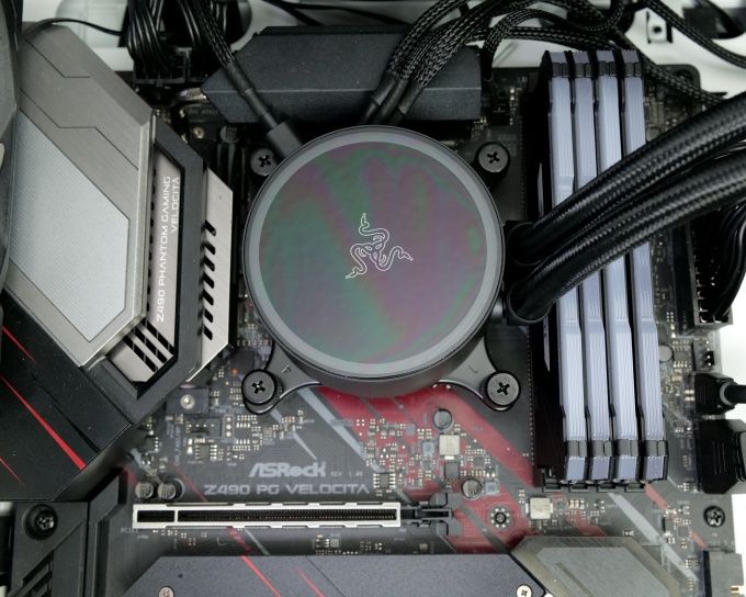 Die Kühler-Pumpen-Einheit wird dann mit Rändelmuttern direkt auf diesen Bolzen befestigt. Die Schläuche und Kabel kommen beim Testsystem den RAM-Riegeln bzw. einem Spannungswandlerkühler nah, finden aber gerade so genug Platz.