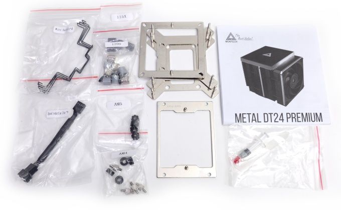 Montech liefert den Luftkühler mit Montagematerial, vier Lüfterklammern, einer Dosierspritze mit Wärmeleitpaste und Spachtel, Anleitung sowie einem Low-speed-Adapter für die Lüfter aus.