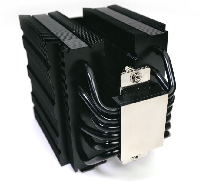 Die Bodenplatte besteht aus vernickeltem Kupfer. Sie leitet die Abwärme des Prozessors zu sechs nebeneinander angeordneten 6-mm-Heatpipes weiter.