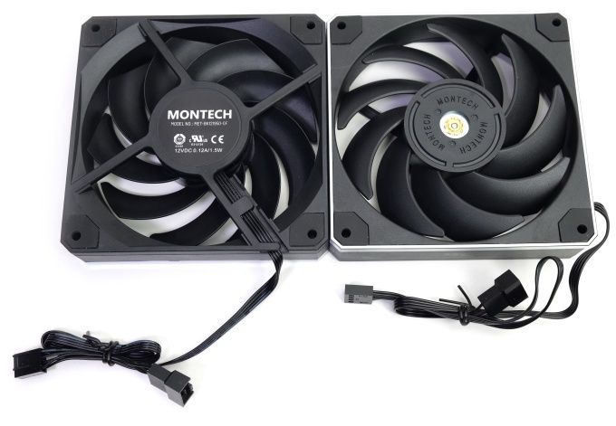 Als Lüfter werden zwei Montech Metal 120 PWM eingesetzt. Diese unbeleuchteten 120-mm-Lüfter fallen optisch vor allem dadurch auf, dass ihre Vorderseite von einem Metallrahmen eingefasst wird. Den Drehzahlbereich gibt Montech mit 800 - 1.950 U/min an. Die Minimaldrehzahl fällt damit vergleichsweise hoch aus - und bei unserem Testsample sogar noch um einiges höher, als angegeben. Beide Lüfter konnten wir nur auf etwa 1.100 U/min herunterregeln. Der mitgelieferte Low-Noise-Adapter senkt zwar die Maximaldrehzahl deutlich auf 1.500 U/min ab, die Minimaldrehzahl sinkt aber gerade einmal auf etwa 1.000 U/min.