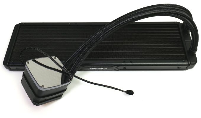 Die Kühler-Pumpen-Einheit fällt mit ihrer spiegelnden Abdeckung selbst unbeleuchtet auf. Ansonsten zeigt sich die AquaFusion ADV 360 als konventionell gestaltete AiO-Kühlung, bei der die Kühler-Pumpen-Einheit über zwei Schläuche mit einem schlanken Radiator verbunden ist. Die Schläuche sind jeweils 40 cm lang und textilummantelt.
