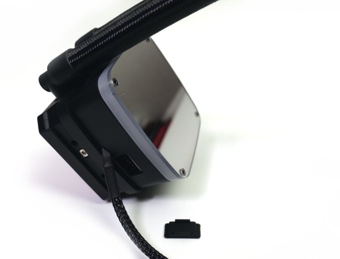 Hinter der spiegelnden Abdeckung auf dem Pumpendeckel verbirgt sich eine Unendlichkeits-Beleuchtung, die erst mit aktiver Beleuchtung sichtbar wird. Sie wird seitlich durch einen Luminous Aurabelt ergänzt. Darunter versteht Enermax eine Beleuchtung, die sich komplett seitlich um den Pumpendeckel zieht. Zur Beleuchtungssteuerung wird eines der mitgelieferten A-RGB-Kabel an einem seitlichen Anschluss angesteckt. Bei Auslieferung versteckt sich der Anschluss unter einer Gummi-Abdeckung.