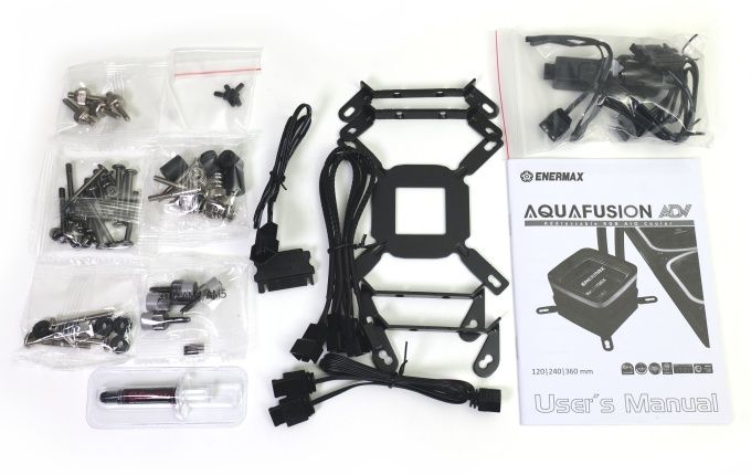 Enermax liefert die AquaFusion ADV 360 mit umfangreichem Zubehör aus. Neben Anleitung und Montagematerial liegen eine Dosierspritze mit Wärmeleitpaste, ein Dreifach-PWM-Adapter, ein S-ATA-auf-Lüfterbuchse-Adapter sowie ein A-RGB-Controller mit diversen Anschlusskabeln und Adaptern bei.
