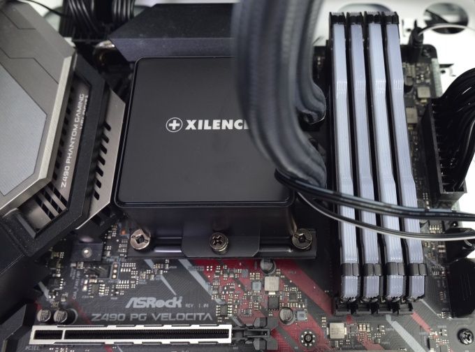 Die Kühler-Pumpen-Einheit kann dann mit Montagehülsen auf die Montagestege geschraubt werden. Auf der Testplattform gab es dabei keinerlei Kompatibilitätsprobleme. Auch die seitlich sitzenden Schläuche halten noch genug Abstand zu den RAM-Riegeln.