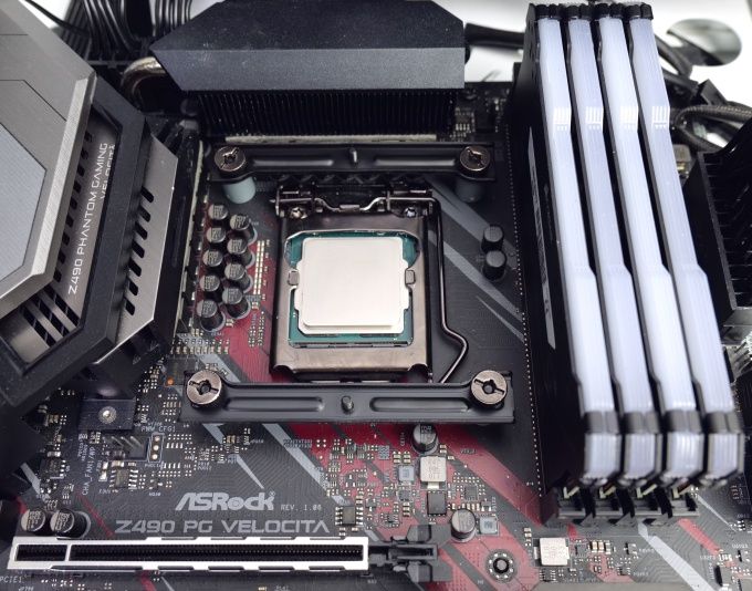 Zu Montage auf der LGA-1200-Testplattform haben wir die passende Backplate rückseitig am Mainboard platziert. Auf die Montagebolzen werden Abstandshalter und Montagestege gesteckt und mit Rändelmuttern befestigt.