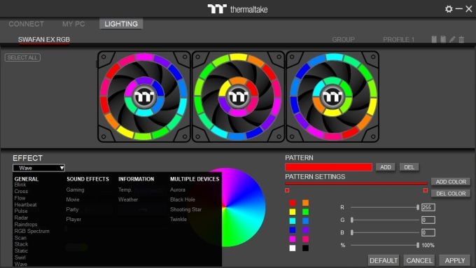 Zur Steuerung der Lüfter und der Beleuchtung dient die TT RGB PLUS-Software. Für die Drehzahlsteuerung können Profile genutzt, ein Regelwert in 10-%-Schritten angepasst oder auch eine Lüfterkurve vorgegeben werden.