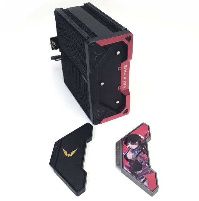 Die Abdeckung zeigt zwei kleine A-RGB-Leuchtelemente aus je drei beleuchteten Strichen. Sie wird zum Teil von einem lachsfarbenen Alu-Streifen eingefasst. Im Zentrum kann eine von zwei magnetisch haftenden Plaketten angebracht werden. Die schwarze Plakette zeigt einfach nur das Valkyrie-Logo in Gold. Auffälliger ist die lachsfarbene Manga-Plakette. Beide Plaketten bestehen aus Kunststoff.