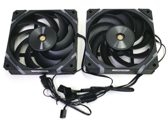 Valkyrie legt zwei 120-mm-Lüfter bei. Bei einem ist der Rotor gedreht - das ist bei der Montage zu beachten. Beide PWM-Lüfter arbeiten offiziell mit 800 - 2.150 U/min (± 10 %). Am Testsystem konnten wir sie zwischen 750 und 2.200 U/min regeln. An den Ecken werden jeweils Leuchtstreifen von A-RGB-LEDs in Szene gesetzt.