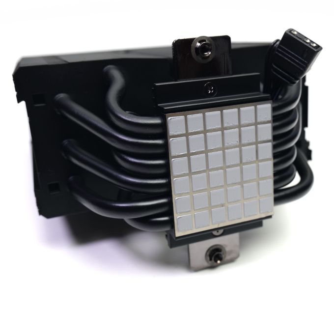 Bei Auslieferung befindet sich bereits Wärmeleitpaste für die Erstmontage am Kühlerboden. Vorbildlich ist, dass Valkyrie zusätzlich aber noch eine separate Dosierspritze mit Wärmeleitpaste beilegt. Um Vergleichbarkeit zu gewährleisten, testen wir auch den Vind SL125 aber mit Arctic MX-2. Durch die 42 x 38 mm große Kühlerbodenplatte verlaufen sechs schwarze 6-mm-Heatpipes. Für die Kühlerbeleuchtung wird ein 3-Pin-A-RGB-Anschluss genutzt.