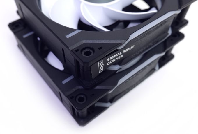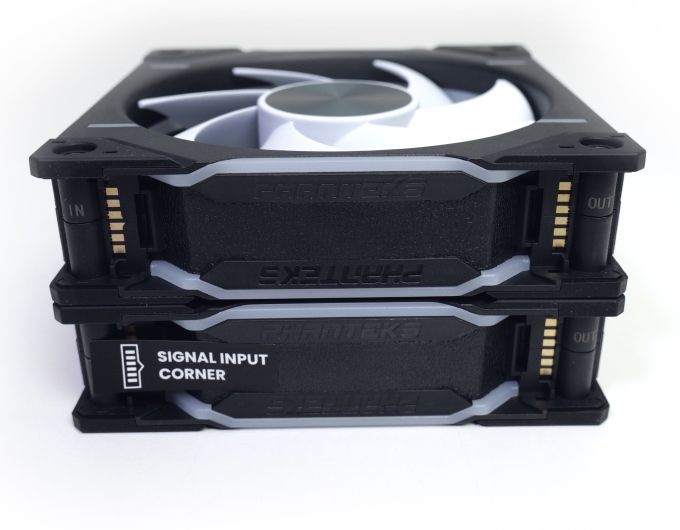 An den Lüftern hängen bei Auslieferung keine Kabel. Die mitgelieferten modularen Kabel werden an eine bestimmte Lüfterecke geclipst, die mit "In" bzw. einem Aufkleber markiert ist. Die Kontaktflächen an der "Out"-Ecke ermöglichen es, mehrere Lüfter miteinander zu verbinden. Laut Phanteks ist es wichtig, dass Ein- und Ausgang nicht verwechselt werden.
