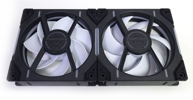 Der Unterschied zwischen regular- und reversed-Modell wird am besten deutlich, wenn man sich einfach beide Lüfter nebeneinander ansieht. Das regular-Modell auf der linken Seite zeigt den Rotor mit der typischen Ausrichtung, die für einen Luftstrom nach hinten sorgen würde. Der reversed-Lüfter hat hingegen einen gedrehten Rotor, bei dem der Luftstrom nach vorn geblasen wird. Dadurch kann der Lüfter als einblasender Lüfter an der Seite oder am Boden montiert werden, ohne dass die Streben zur Lüfternabe das Bild stören. Phanteks beleuchtet bei diesen Lüftern einen Leuchtring im Inneren des Lüfterrahmens, den Rotor, sowie weitere Leuchtstreifen an Außenseiten des Rahmens.