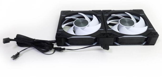 Wenn mehrere Lüfter miteinander verbunden werden sollen, clipst man sie mit einer Kontaktbrücke und einem Verbinder zusammen. Dazu können Kunststoffabdeckungen auf die offen gestalteten Ecken gesetzt werden. Diese Elemente wirken allerdings nicht besonders hochwertig. Wenn mehrere D30-120 miteinander verbunden sind, benötigen sie nur eines der speziellen Anschlusskabel. Dieses Kabel endet in einem PWM-Stecker und in zwei Phanteks-eigenen A-RGB-Anschlüssen. Ein Adapter auf den größeren Standard-A-RGB-Anschluss liegt bei.