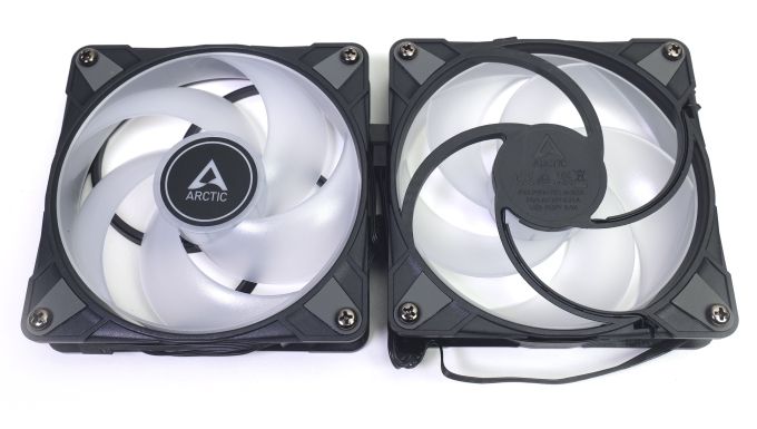 Die beiden A-RGB-Lüfter des Freezer 36 A-RGB Black sind Arctics P12 PWM PST A-RGB (Black). Die 120-mm-Lüfter laufen laut Arctic PWM-gesteuert mit 200 - 2.000 U/min. Bei einem PWM-Wert unter 5 % greift ein Lüfterstopp. An unserem Testsample liefen die Lüfter erst mit einem etwas höheren PWM-Wert von 8 % an, die Minimaldrehzahl lag dafür mit knapp über 100 U/min sogar noch niedriger als angegeben.