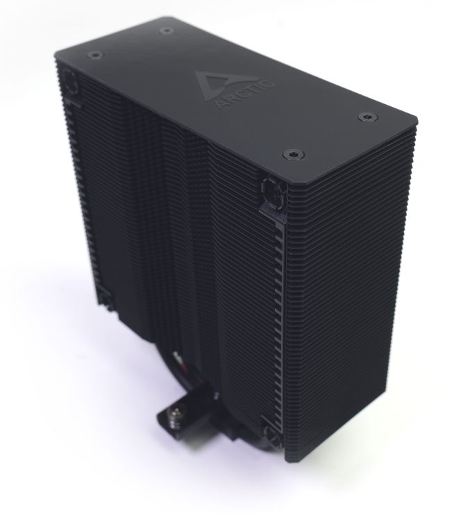Der Kühlkörper fällt beim Freezer 36 A-RGB Black schlank aus. Arctic hält ihn bei dieser Kühlervariante komplett in Schwarz. Der Hersteller gibt an, dass der Kühlkörper ein neues Design nutzt, bei dem Öffnungen an den Seiten das Ansaugen von zusätzlicher Frischluft möglich machen.