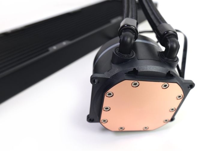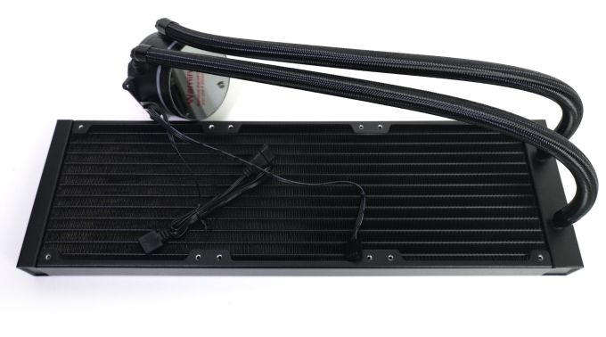 Die Iceberg 360 zeigt sich als 360-mm-AiO-Kühlung mit typischem Aufbau. Ein schlanker Aluminiumradiator wird über textilummantelte Schläuche mit einer Kühler-Pumpeneinheit verbunden. Die Schläuche sind 40 cm lang.