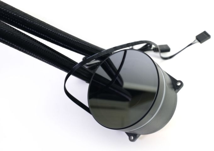 Die Kühler-Pumpeneinheit hat ein rundes Kunststoffgehäuse. Sie zeigt einen seitlichen Leuchtring und einen spiegelnden Deckel mit Infinity-Mirror. Im Deckel wird auch ein Chieftec-Schriftzug beleuchtet. Damit der immer richtig ausgerichtet werden kann, lässt sich der Pumpendeckel einfach um 360 Grad drehen. An der Kühler-Pumpeneinheit hängen ein PWM- und ein A-RGB-Kabel.