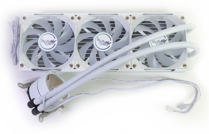 Wir haben die A360 in der weißen Farbvariante erhalten. Bis auf einzelne schwarze Akzente zeigt sich die AiO-Kühlung tatsächlich überwiegend in Weiß. Das gilt auch für die Anschlusskabel und die textilummantelten Schläuche. Die verbinden den Radiator mit der Kühler-Pumpeneinheit. Auf dem Radiator sind bei Auslieferung bereits die drei 120-mm-Lüfter vormontiert und miteinander verkabelt.