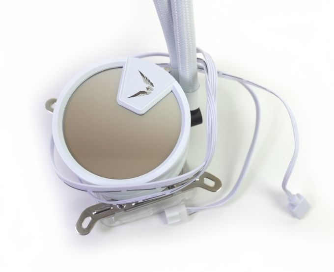 Der Deckel der Kühler-Pumpeneinheit kann gerastert um 360° gedreht werden. Die Ausrichtung des Valkyrie-Logos lässt sich so flexibel anpassen. Der Deckeleinsatz wirkt erst einmal spiegeln. Bei aktiver Beleuchtung erstrahlt die gesamte Spiegelfläche in den bunten Farben der daruntersitzenden A-RGB-LEDs. An der Kühler-Pumpeneinheit hängen zwei Kabel: Ein PWM- und ein A-RGB-Kabel. Über das PWM-Signal kann die Pumpe zwischen 800 - 2.400 U/min (± 10%) geregelt werden.