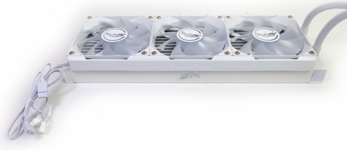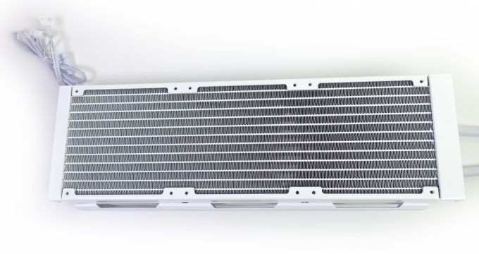 Auch der Radiator zeigt sich in Weiß. Der Aluminiumwärmetauscher misst 397 x 120 x 27 mm (L x B x H) und fällt damit ziemlich schlank aus. Das kommt der Gehäusekompatibilität zugute.