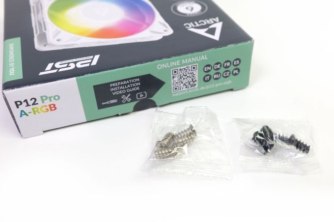 Der Lieferumfang könnte kaum minimalistischer sein. Dem Lüfter liegt nur ein Tütchen mit Lüfterschrauben bei. Beim weißen P12 Pro A-RGB sind diese Schrauben silberfarben, beim schwarzen P12 Pro hingegen schwarz. Eine Anleitung wird nicht mitgeliefert, sie kann aber online eingesehen werden. QR-Code und Link dazu findet man auf der Verpackung.