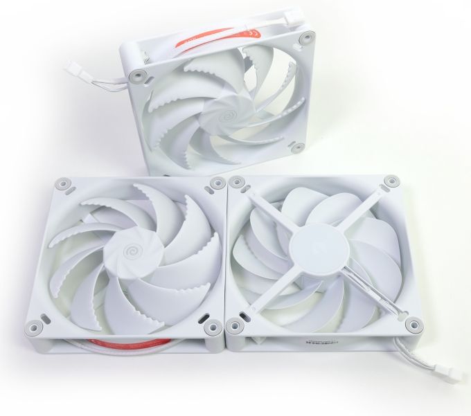 Das Loopin Cable System sorgt mit einer Kombination aus PWM-Stecker und Buchse dafür, dass die Lüfter miteinander gekoppelt werden können. Dabei lassen sich die Kabel durch Öffnungen in den Lüfterecken führen und so elegant verlegen. Allerdings liegt dem Triple-Pack nur ein einziges Verlängerungskabel bei. Das ist ungünstig, wenn man die Lüfter getrennt voneinander nutzen möchte. An den Ecken der Lüfter sorgen Gummiringe für eine entkoppelte Montage.