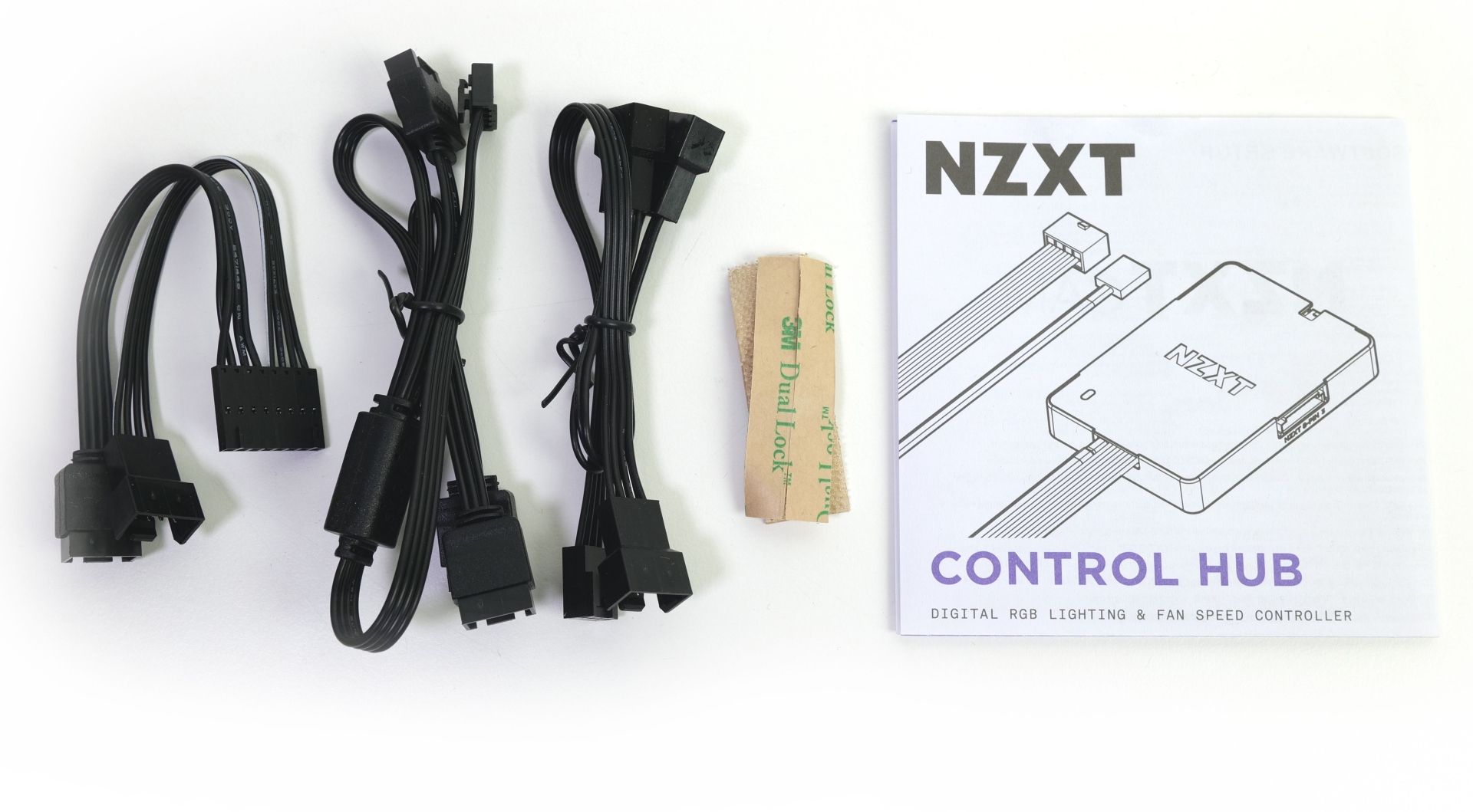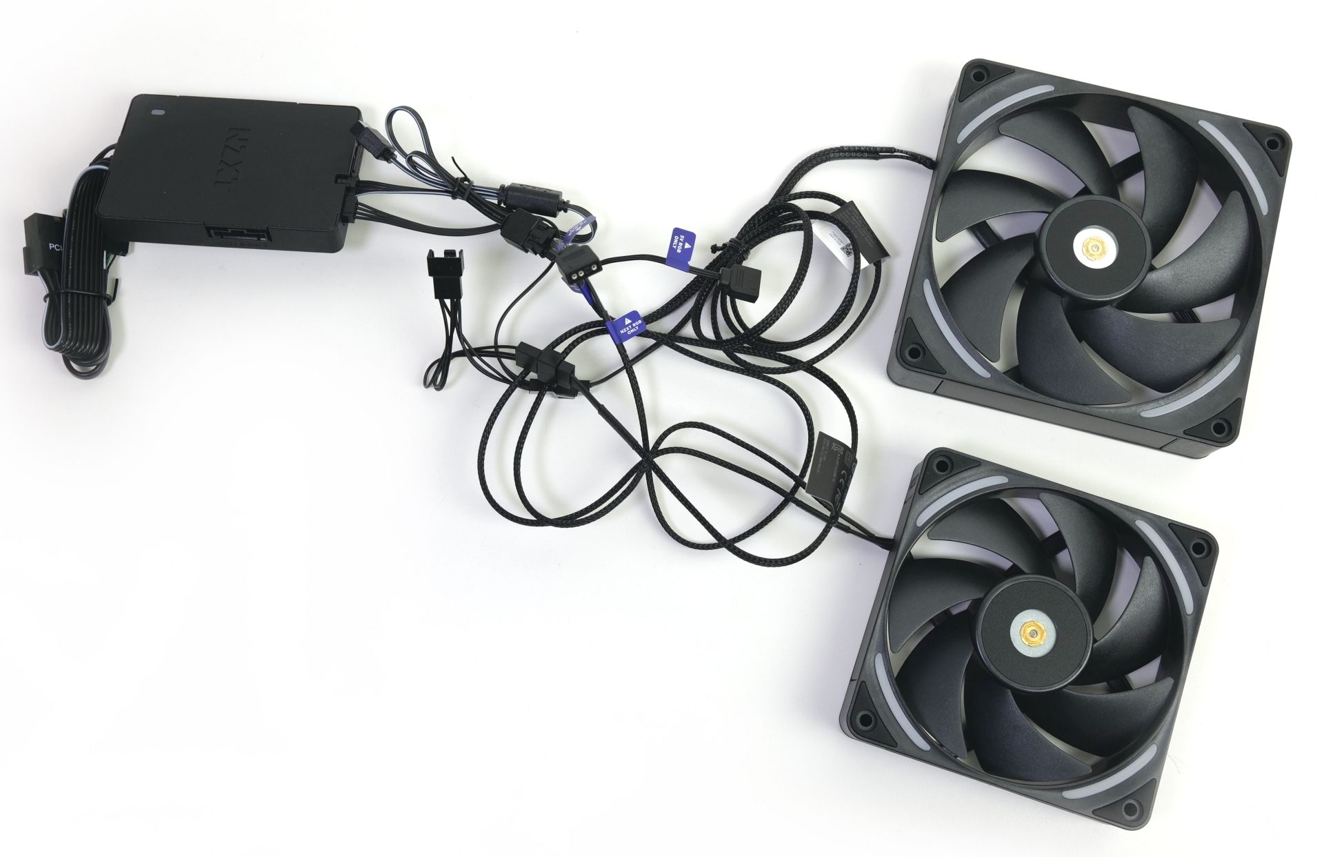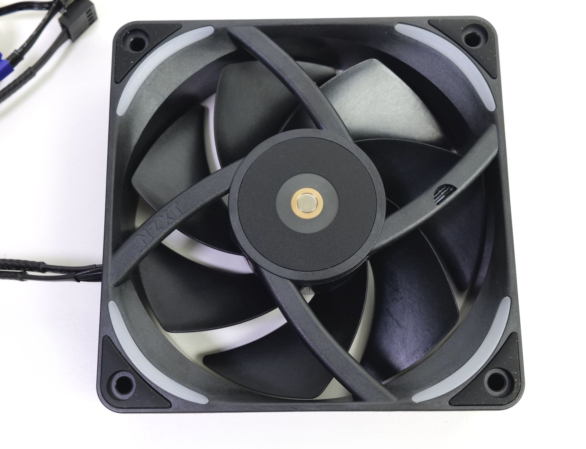 Im Gegensatz zu diesen beiden Konkurrenzmodellen werden die F120X beleuchtet. Dabei hat NZXT sich aber für eine relativ dezente Umsetzung entschieden. Der Rotor bleibt unbeleuchtet. Stattdessen zeigen sich an den vier Ecken beleuchtete Kreisabschnitte, für die NZXT insgesamt 16 A-RGB-LEDs verbaut. Der F120X ist Teil einer Lüfterfamilie. Neben ihm gibt es das 140-mm-Modell F140X, das wir ebenfalls testen. Zudem bietet NZXT auch Kombi-Lüfter an, bei denen mehrere Rotoren in einem gemeinsamen Lüfterrahmen verbaut werden. Das sind die Modelle F240X, F280X und F360X. NZXT bietet sowohl schwarze als auch weiße Varianten an. Die Lüfter können einfach über reguläre PWM- und A-RGB-Anschlüsse gesteuert werden. Als Zubehör wird der NZXT Control Hub für die Steuerung über NZXT CAM angeboten.
