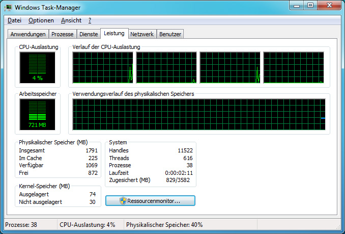 Auch der Task-Manager stellt die vier Threads problemlos dar, hier noch ohne Last. Später wollen wir uns aber besonders auf die Leistung während der Wiedergabe von HD-Inhalten konzentrieren. Doch zunächst werfen wir einen genaueren Blick auf das Zotac-ION-Mainboard.