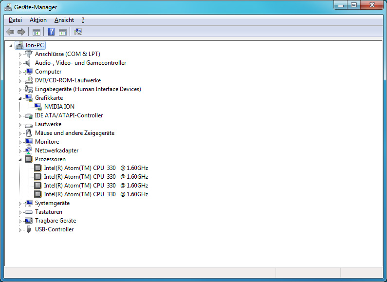 Im Geräte-Manager wird der Atom 330 als 4-Thread-Prozessor mit jeweils 1,6 GHz erkannt.