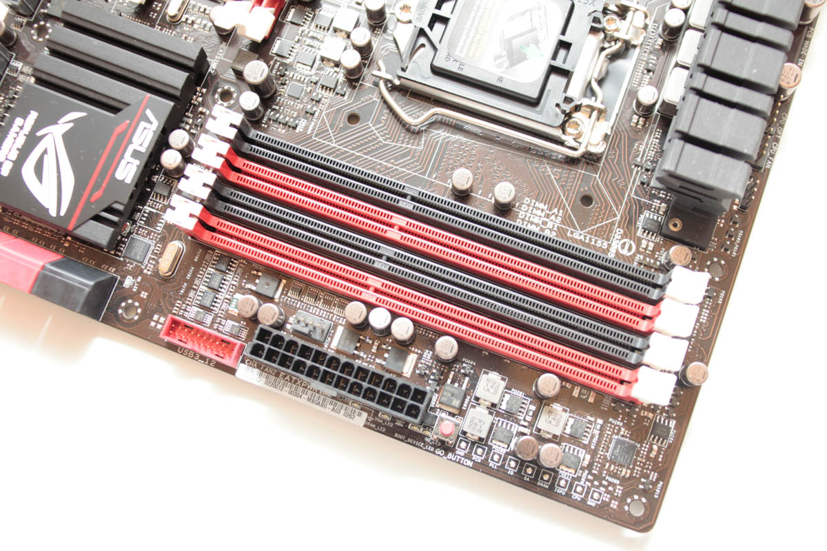 Die vier Speicherbänke sind bei dem Z77-Chipsatz als Standard anzusehen. Sie können jeweils mit 8-GB-Modulen belegt werden. Insgesamt kann somit das Board bei aktuellen Speichermodulen also mit bis zu 32 GB bestückt werden. In der Realität werden solche Arbeitsspeicherausbauten jedoch selten genutzt, im Grunde reichen 16 GB für den ambitionierten Spieler aus. Workstations oder Server für virtuelle Maschinen sind sehr ramhungrig, hier machen dann 32+ GB durchaus mehr Sinn, jedoch nutzt man dann dazu keine Spielerboards wie dieses. Die Speichermodule verwenden den ASUS-typischen Schnell-Einbau-Mechanismus, der die Module nur noch auf einer Seite arretiert.
