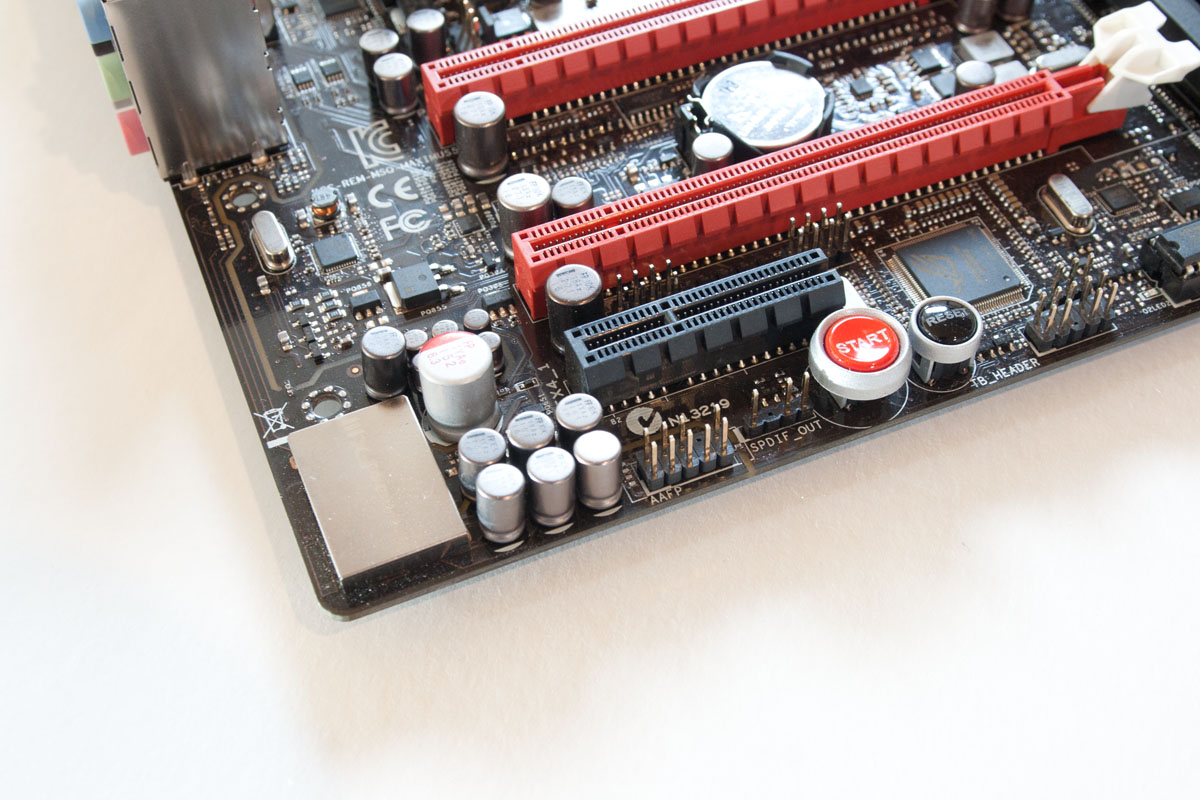 Der Zusammenbau des Boards mit den weiteren Komponenten erledigt sich ohne große Mühen. Sämtliche Schnittstellen sind klar und leserlich beschriftet und geben auch keinen Zweifel auf. Für die Nutzung der kleinen Pinleiste für Power- und Resetschalter, Festplatten-LED etc. kann man ASUS-üblich mit dem Q-Connector alles vorher anschließen und in einem Stück alles auf das Board stecken. Wenn man oftmals Versuche mit unterschiedlicher Hardware unternimmt oder sein Gehäuse offenstehen lässt, so nutzt man auch den Start- und Resetknopf des Boards, welcher sich unterseitig des letzten Steckplatzes befindet. Eine kleine Festplatten-LED befindet sich zusätzlich noch auf dem rechten äußeren Rand des Boards.