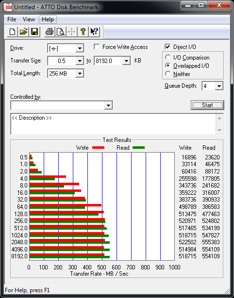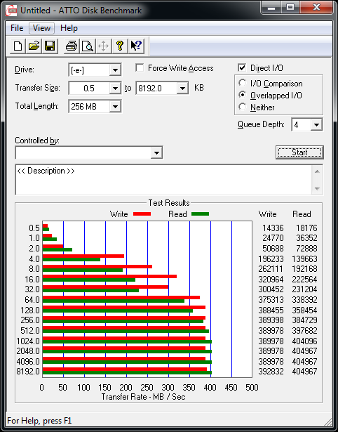 Wir haben gewohnte Ergebnisse erhalten: Der Z87-Chipsatz versetzt das SSD-Laufwerk wieder an seine Grenzen und erreicht schreibend um die 555 MB/s und lesend um die 520 MB/s. Ein anderes Bild zeigt wieder mal der ASM1061, bei dem bis 400 MB/s lesen Schluss ist. Die Schreibrate liegt bei runden 390 MB/s.