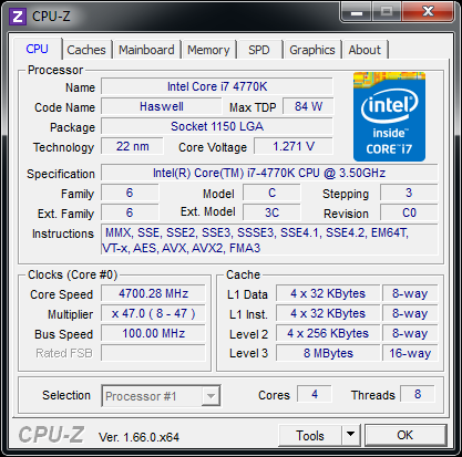 Zusammen mit dem ASRock Z87 Professional haben wir mit dem i7-4770K erneut die 4,7 GHz knacken können. Um das Ganze dann auch stabil zu erhalten, benötigte die CPU eine Spannung von 1,271 Volt. Dann sind wir eine Stufe höher gegangen und haben den 48er-Multiplikator fixiert. Der Bootvorgang klappte reibungslos. Als wir das System dann allerdings unter Last setzen wollten, erhielten wir kurzerhand einen Bluescreen. Da half auch eine Spannung von 1,3 Volt nicht weiter. Eine Übertaktung mit den anderen CPU-Straps war hingegen gar nicht möglich. Das System wollte lediglich mit dem 1.0-CPU-Strap booten.