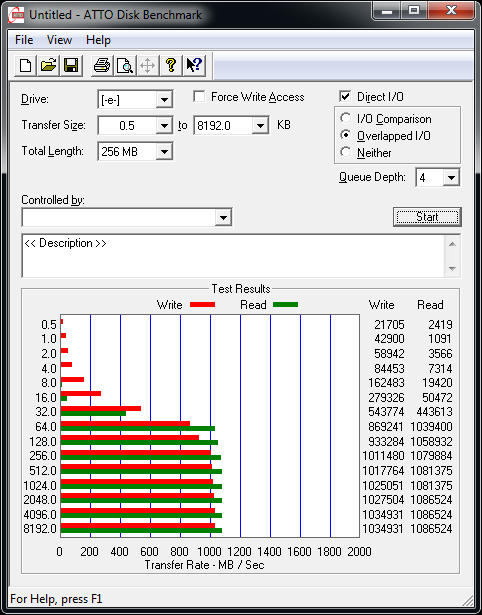 Mit diesen Werten steht fest, dass die vier PCIe-3.0-Lanes zu Werke gegangen sind. Die Leserate stieg auf stolze 1086 MB/s, auch wenn die Herstellerangabe in diesem Punkt nicht erreicht wurde. Dafür wurde die Schreibrate mit 1034 MB/s deutlich überboten.