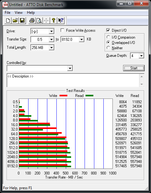 Über die SATA-6G-Ports bekommt der Anwender die gewohnte Leistung serviert. So wurden im Lesen ganze 557 MB/s erreicht, die Schreibdurchsatzrate kletterte dagegen bis auf 520 MB/s. Insgesamt sind das solide Werte!