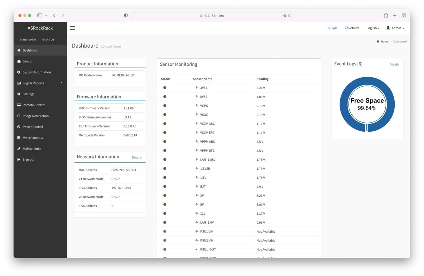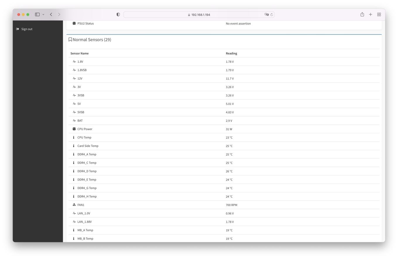 Über das Intelligent Platform Management Interface (IPMI) ist die Steuerung der wichtigsten Komponenten auch ohne physischen Zugriff auf das System oder das ein Monitor angeschlossen ist, möglich. Neben der Überwachung der verschiedenen Sensoren ist es darüber auch möglich, die verbaute Hardware zu identifizieren und ein Firmware/BIOS-Update durchzuführen.