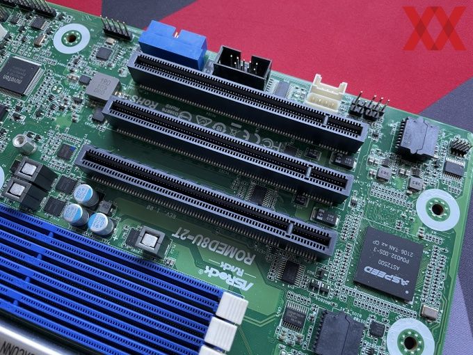 Das ASRock Rack ROMED8U-2T bietet drei PCI-Express-Steckplätze, die Karten mit den vollen 16 Lanes aufnehmen können und auch mit eben diesen 16 Lanes angebunden sind. Allesamt sprechen die Steckplätze das aktuelle PCI-Express 4.0 an, von denen die EPYC-Prozessoren reichlich Lanes bereitstellen. In den Slots untergebracht werden können verschiedene Erweiterungskarten: Netzwerk, Speicher, Compute – vieles ist denk- und machbar.