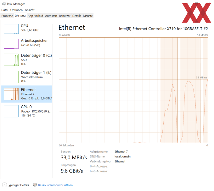 Natürlich haben wir uns auch angeschaut, welche Datenübertragungsraten hier erreicht werden. Dazu haben wir das per 10 GBit/s ans Netzwerk angebundene System genutzt, um ein paar Daten durch das Netzwerk zu bewegen.