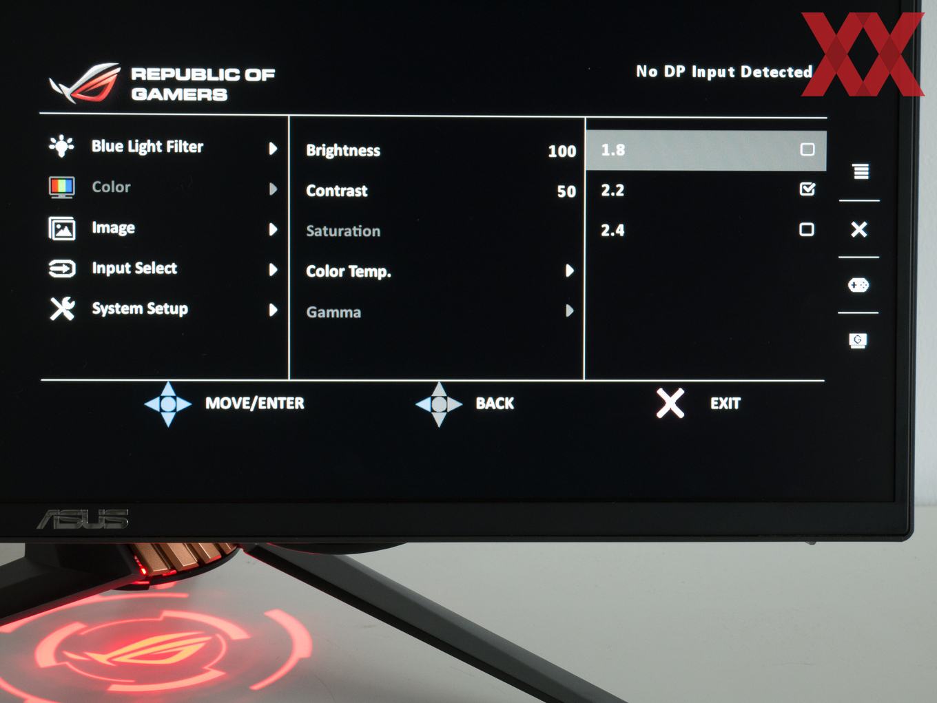Wer das OSD aufruft findet ein typisches ASUS-Menü vor – und das ist mit Sicherheit nichts Schlechtes. Das Menü ist ansprechend gestaltet und übersichtlich aufgebaut – alle Funktionen sind genau dort, wo man sie auch vermuten würde. Der Funktionsumfang geht vollkommen in Ordnung, Farbfetischisten würden sich noch eine 6-Achs-Farbanpassung wünschen, für ein solches Klientel ist der PG258Q aber einfach nicht gedacht.