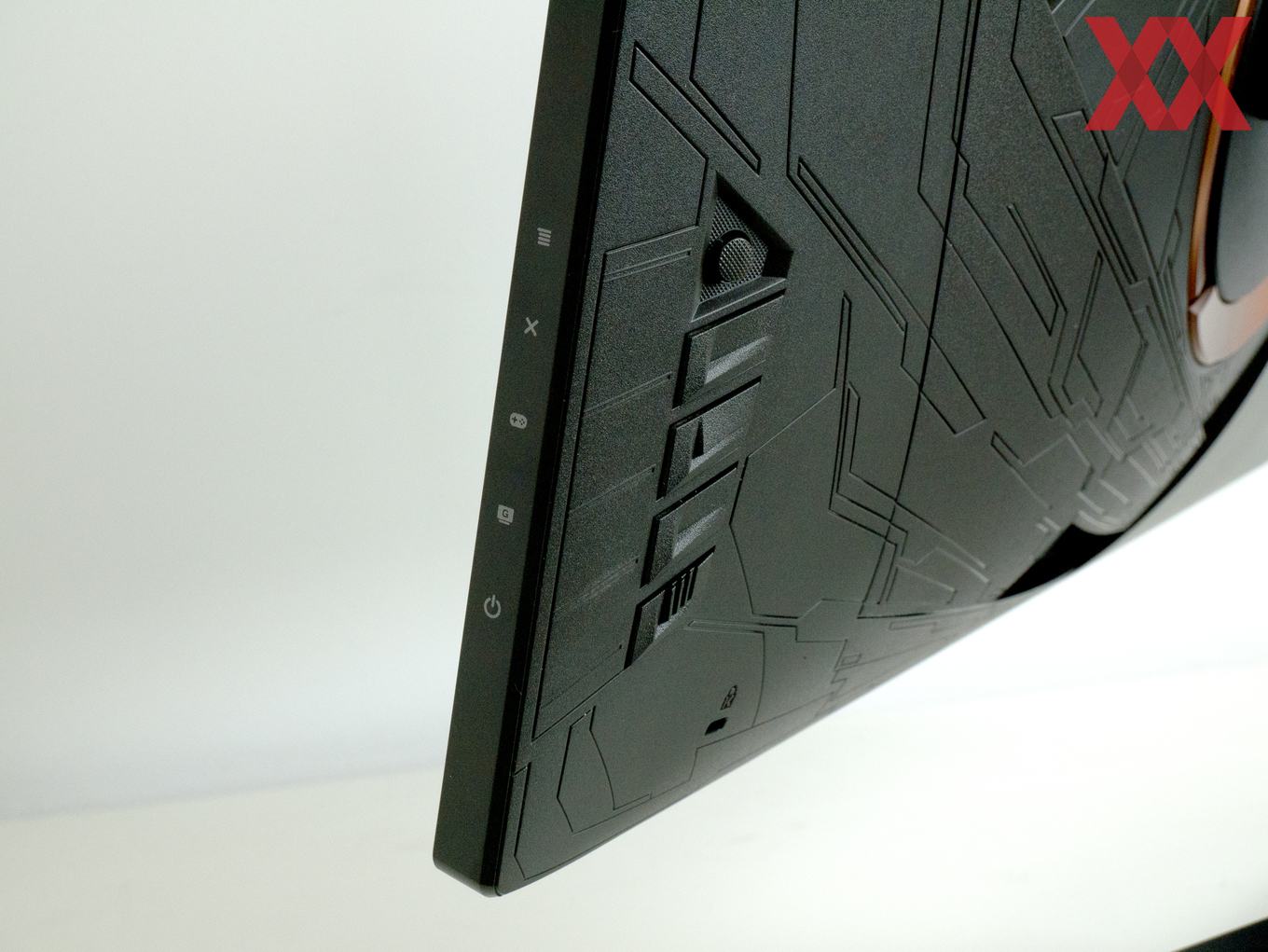 Der PG258Q bietet auf der Front eine sehr saubere Optik. Wie so oft muss aber gerade die mit einigen Kompromissen erkauft werden. Das zeigt sich bereits bei einem Blick auf den Rahmen, denn die Beschriftung ist auf die Außenseite gerutscht. Wer vor seinem Monitor sitzt, hat davon aber herzlich wenig, denn zu sehen ist dann nichts. Keineswegs besser ist es da, dass die Tasten auf der Rückseite platziert wurden.