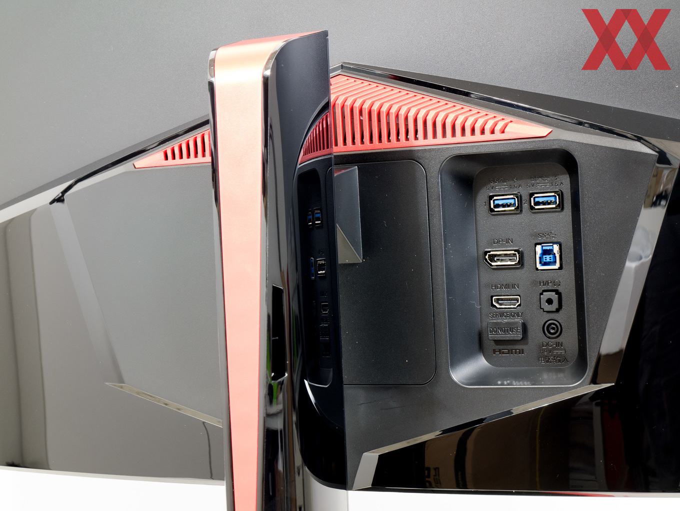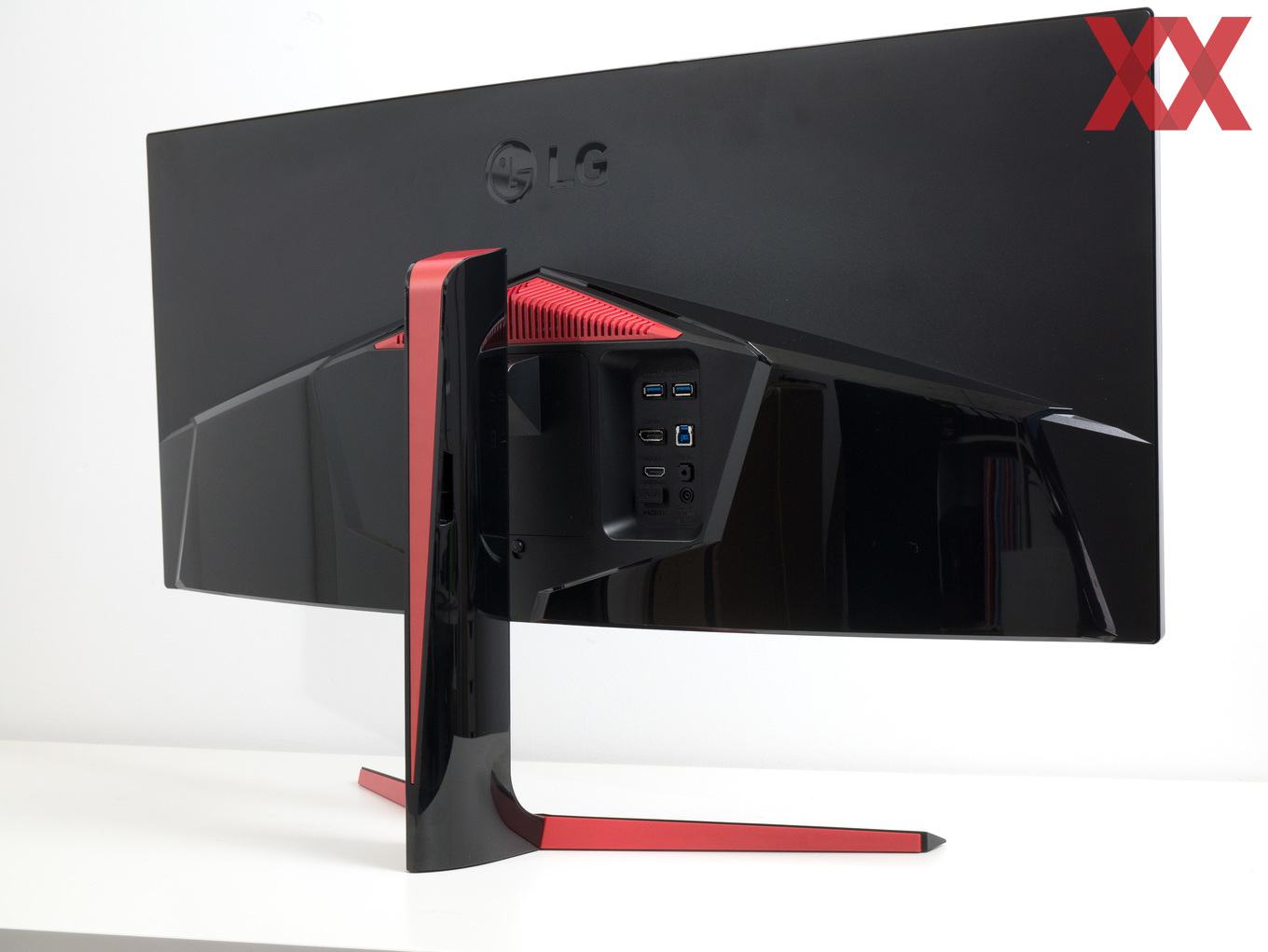 Wird der 34-Zöller gedreht bzw. steht er frei im Raum, fällt auf Anhieb auf, dass LG auf der Rückseite etwas progressiver vorgeht – von vielen Konkurrenten ist man dennoch meilenweit entfernt. Am Auffälligsten ist das große rote Element am Standfuß, das als Eye-Catcher fungiert. Darüber hinaus entscheidet sich LG dazu, von der gänzlich matten Optik Abstand zu nehmen und die untere Hälfte des Gehäuses mit einem Glossy-Finish zu versehen. Dennoch gilt, dass der LG 34UC89G vergleichsweise schlicht ausfällt, denn viele Konkurrenz-Modelle setzen beispielsweise auf eine extrovertierte Beleuchtung.