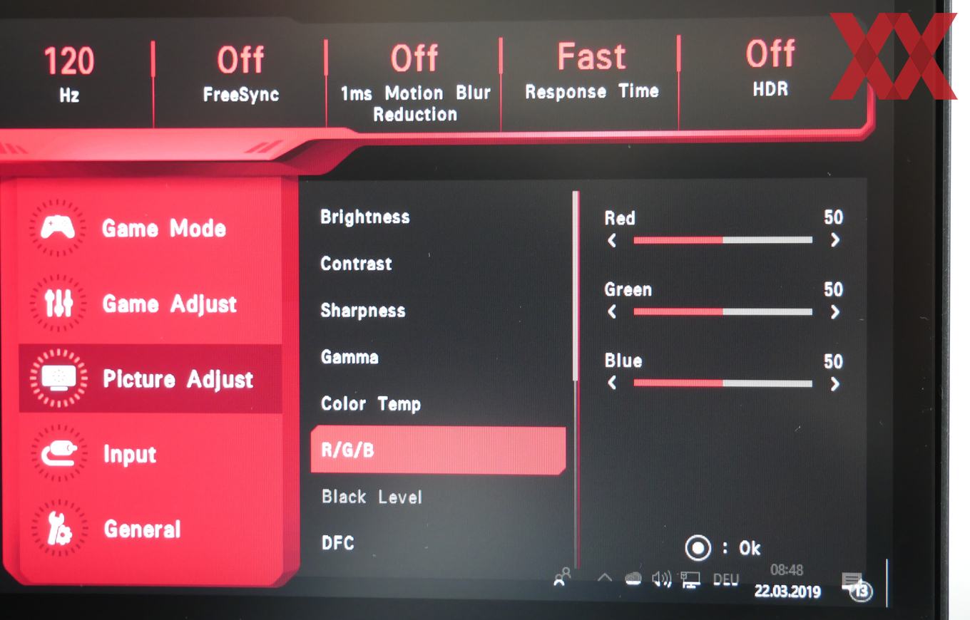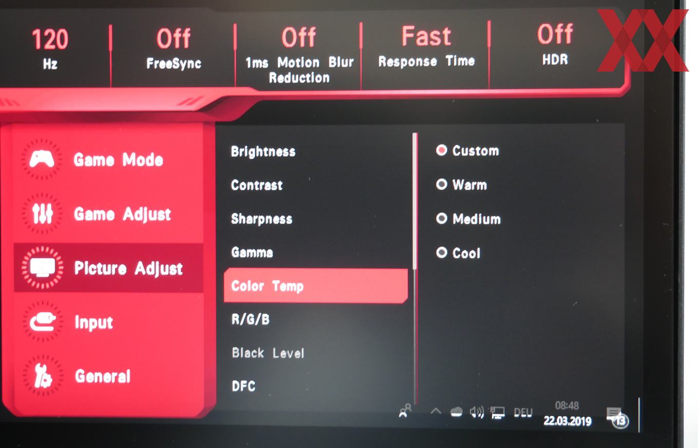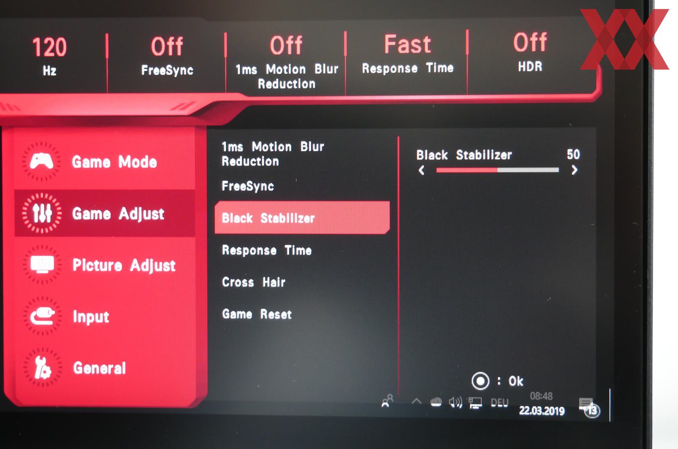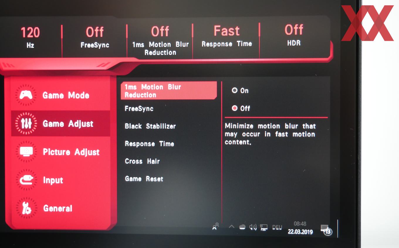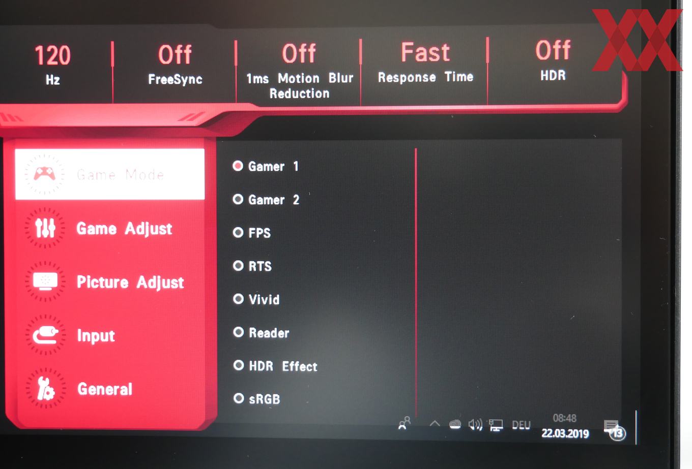 LGs Gaming-OSD weicht optisch von der Lösung der Consumer-Displays ab. Es wird nicht die gesamte rechte Seite eingenommen, sondern nur das rechte untere Eck belegt. Das sonst sehr schlichte Auftreten ist einem schwarz-roten Farbmix gewichen, was natürlich gut zur Gaming-Thematik passt. Das eigentliche OSD ist übersichtlich aufgebaut und gut strukturiert. Gleichzeitig sind alle Funktionen sinnvoll beschrieben, sodass sich auch Einsteiger schnell zurechtfinden. Wie es bei Gaming-Displays üblich ist, werden auch weitere Funktionen geboten. So kann beispielsweise ein Fadenkreuz eingeblendet werden.