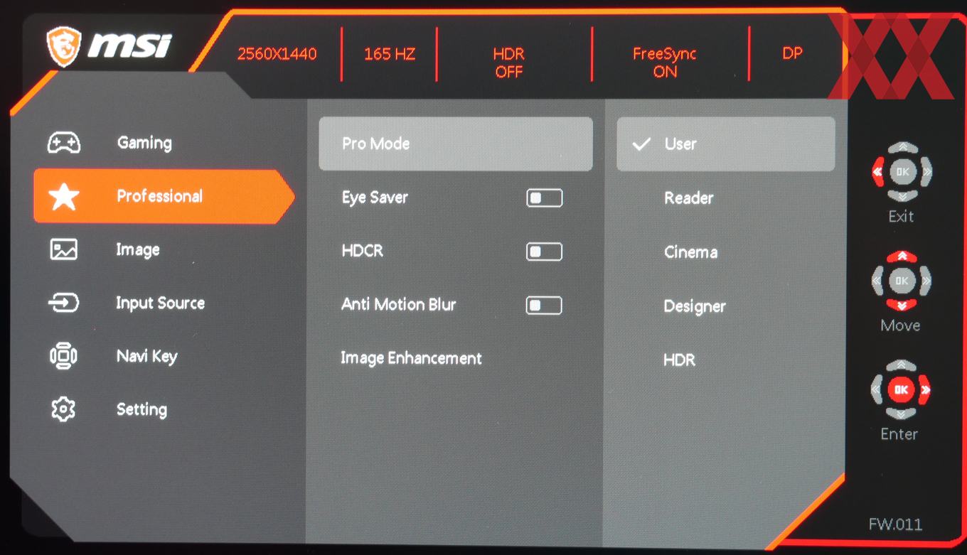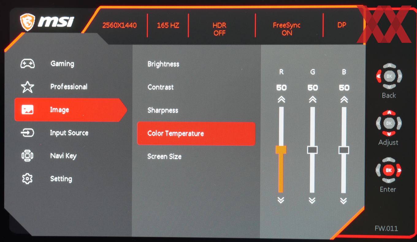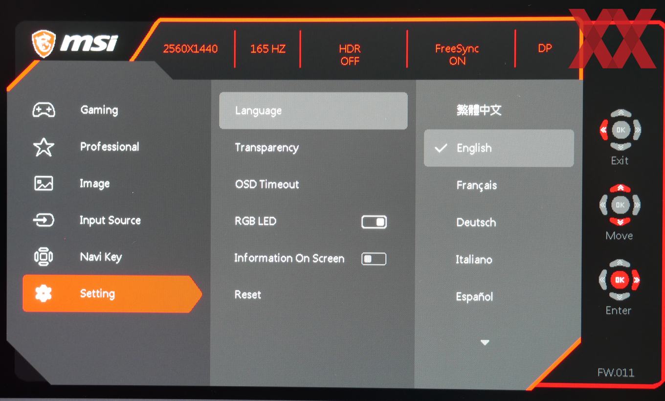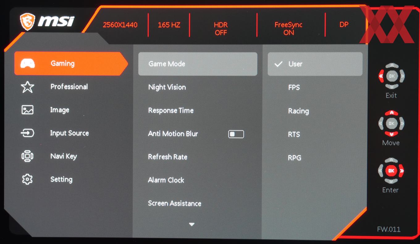 Beim OSD gibt es keine Besonderheiten. MSI setzt auf das bei Gaming-Displays üblicherweise verwendete Menü, das mit einer schicken Optik aufwarten kann. Der Funktionsumfang ist vorbildlich, noch dazu sind alle Funktionen klar und deutlich beschriftet, sodass sich jeder Nutzer eigentlich schnell zurechtfinden sollte. Für Gamer werden nicht nur verschiedene Funktionen hinsichtlich des Overdrives geboten, sondern es besteht auch die Möglichkeit, ein Fadenkreuz einblenden zu lassen oder die FPS darzustellen.