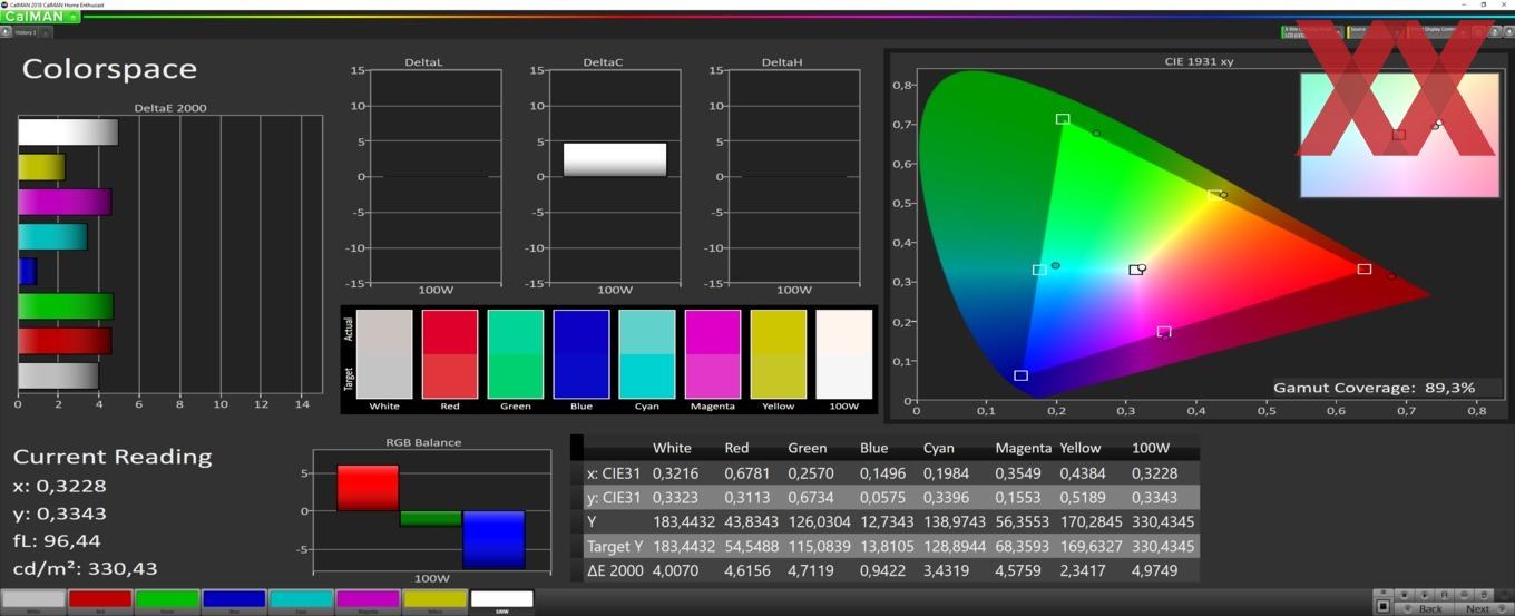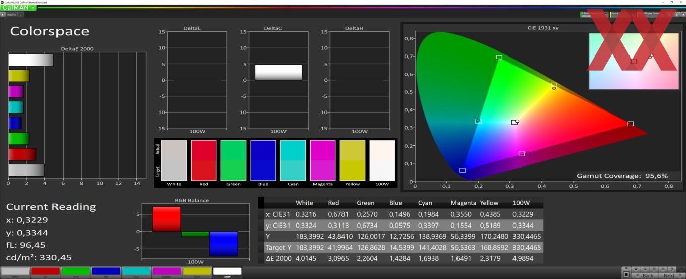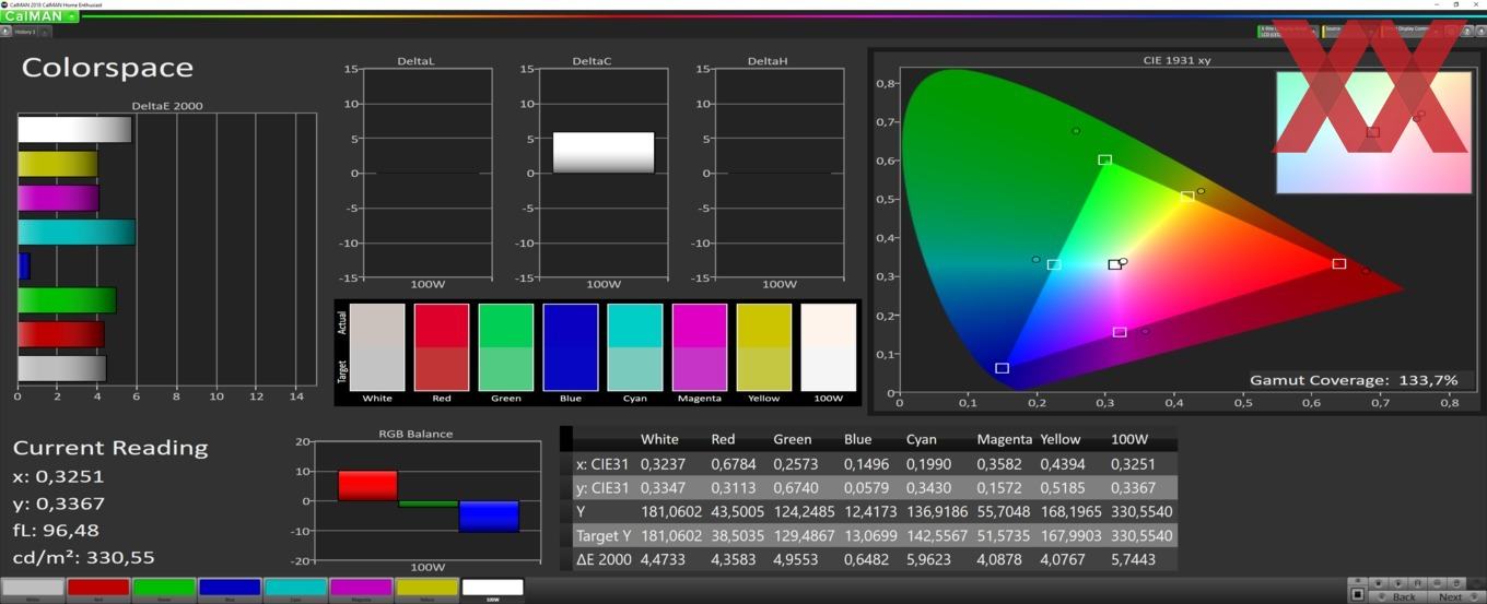 Ab Werk wird der Modus Gamer1 genutzt. Mit einem Weißpunkt von 6.778 K ist das Panel relativ neutral abgestimmt. Wie wir es von Nano-IPS-Panels gewohnt sind, wird ein deutlich erweiterter Farbraum dargestellt. Der noch immer übliche sRGB-Farbraum wird zu 133,7 % abgedeckt. Insbesondere der grüne, aber auch der rote Bereich sind deutlich vergrößert. Der blaue Eckpunkt hingegen passt recht gut. Ihre Vorteile kann die Nano-IPS-Technik bei der Wiedergabe des DCI-P3-Farbraums ausspielen, denn dieser wird zu 95,6 % abgedeckt. Wie üblich wird der AdobeRGB-Farbraum in einem etwas geringeren Umfang abgedeckt, sodass wir hier auf einen Wert von 89,3 % kommen.