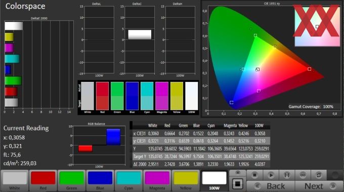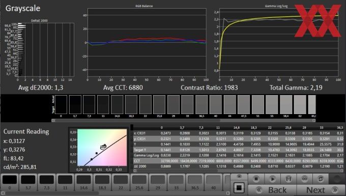 Sehr gut fällt das Graustufen DeltaE aus, das bei gerade einmal 2,2 liegt. Abweichungen in den Grautönen sind somit nicht zu erkennen. Auch im ColorChecker-Test werden gute Ergebnisse geliefert. Der gemittelte Wert liegt mit 2,7 und dem kritischen Wert von 3, sodass Abweichungen mit dem bloßen Augen nicht auffallen. Das Maximum liegt bei 4,3.