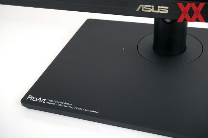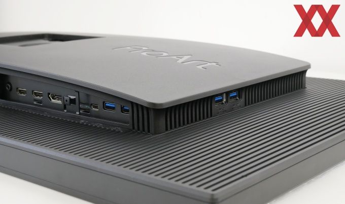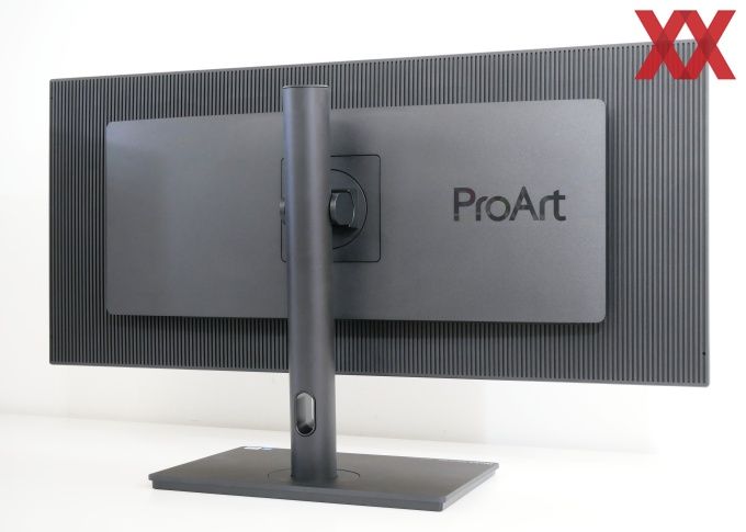 Die Rückseite kann optisch gefallen. Mit einer Riffel-Optik passt es sich gut in die Optik der ProArt-Workstations ein und kann sich gleichzeitig gut von der übrigen Monitor-Konkurrenz absetzen. Die meisten Business-Monitore sind schlicht schwarz gehalten, Gaming-Geräte hingegen oftmals sehr auffällig - den neuen NZXT Canvas 32Q (Test) mal ausgenommen. Da ASUS die Technik kompakt in einer zentralen Box verbaut, wirkt die Tiefe gering, was zu einer schlanken Optik führt.